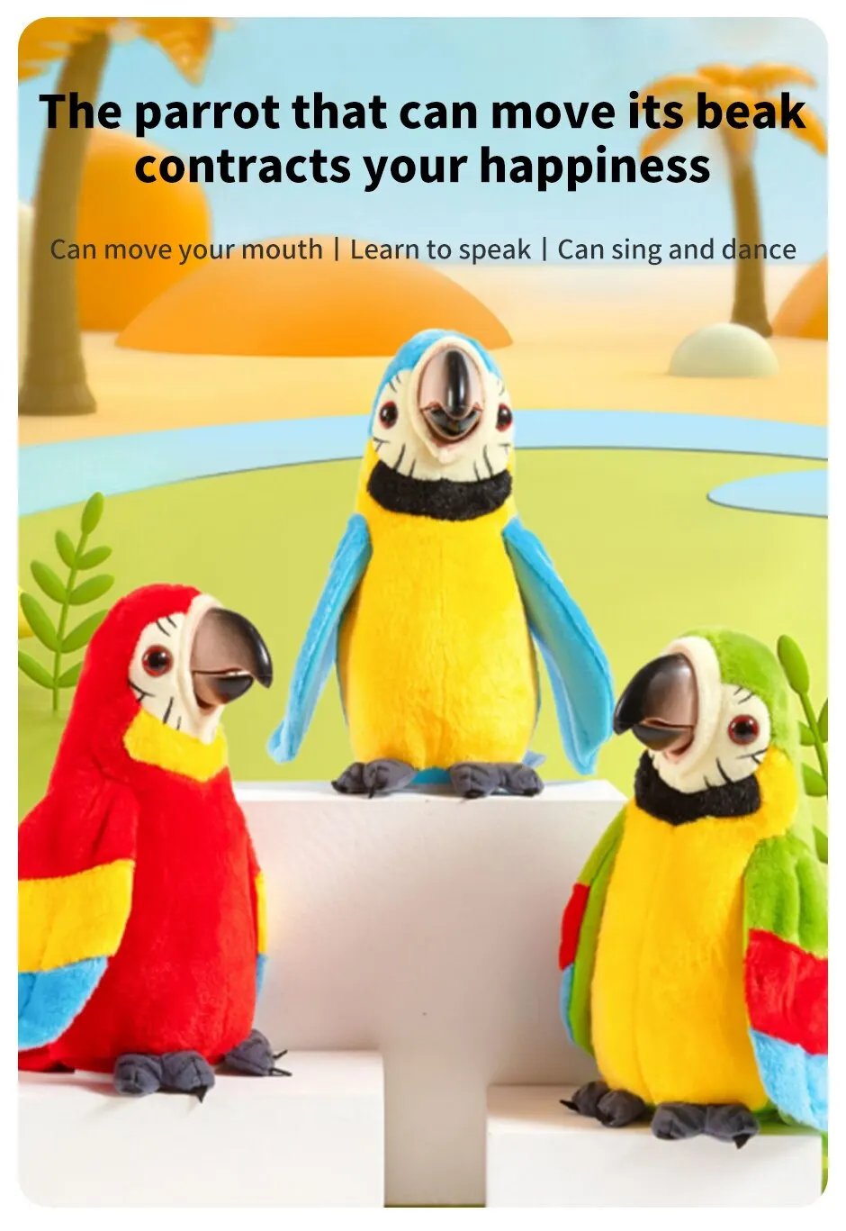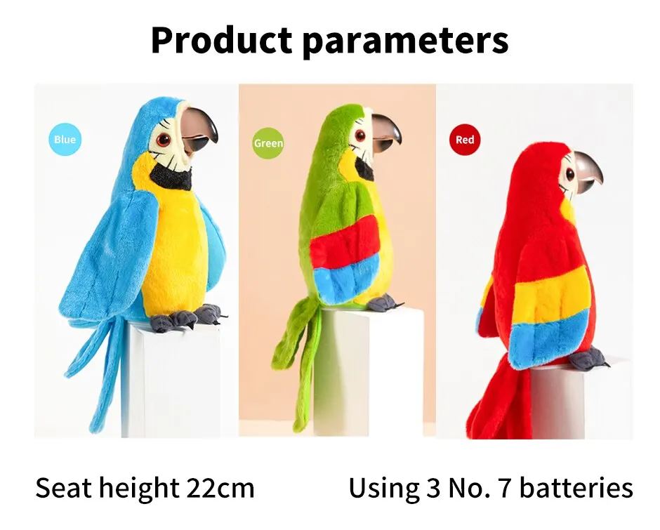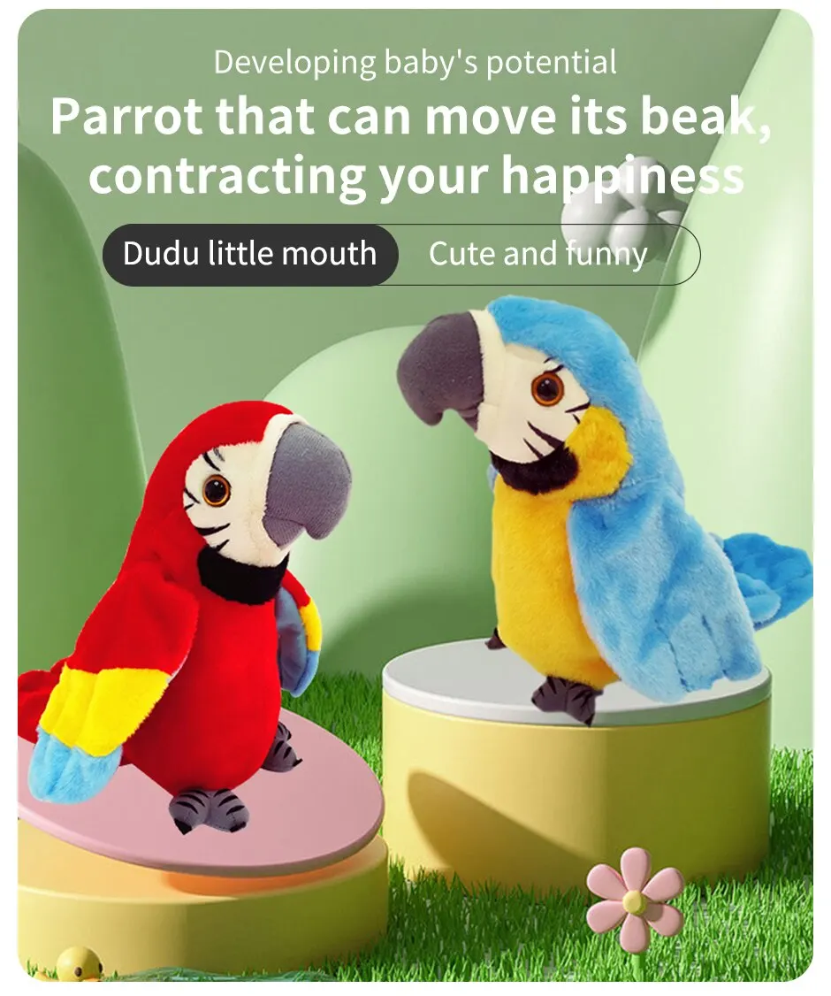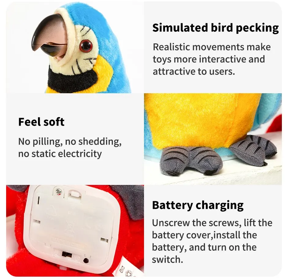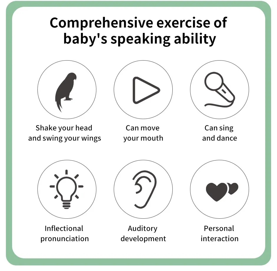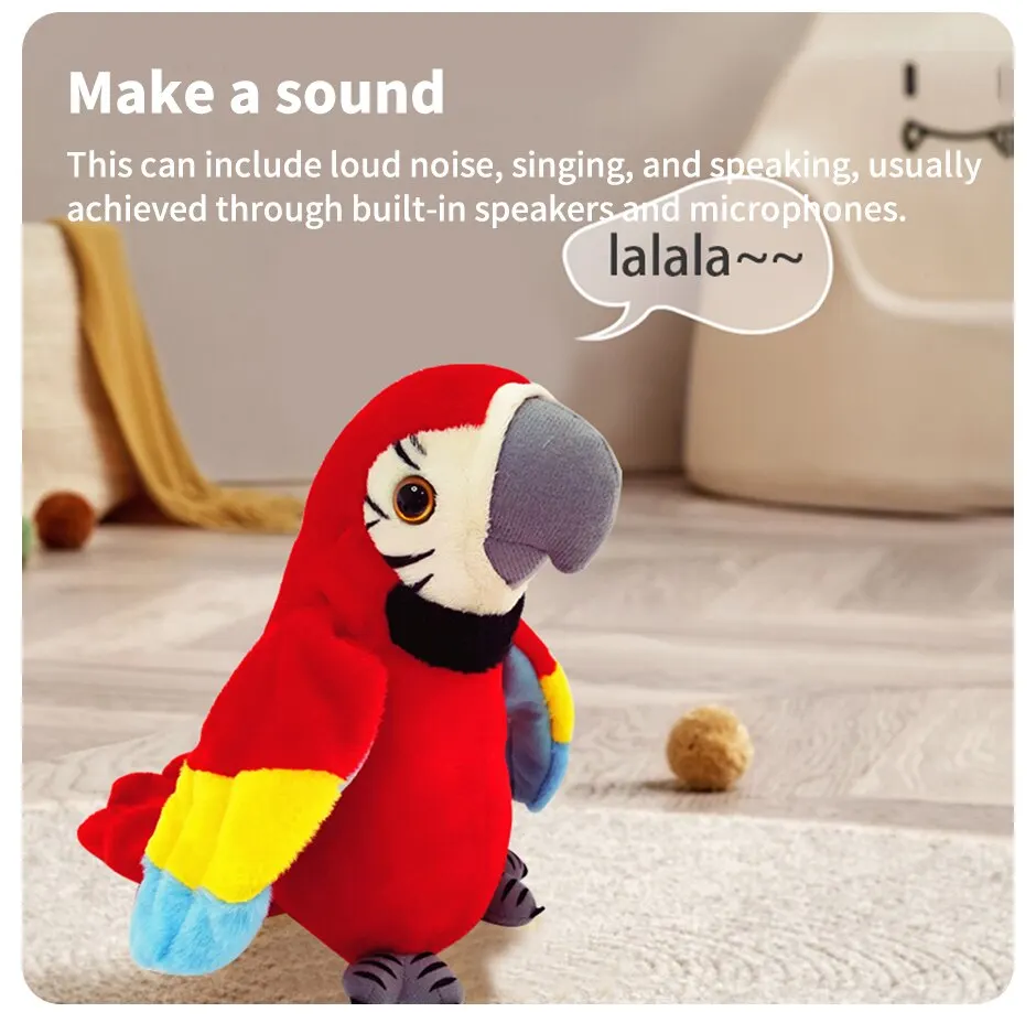 Este papagaio tov tem um alto-falante embutido e microfone que lhe permite cantar, dançar e aprender a falar. Ele também tem uma função de gravação que permite que as crianças gravem suas próprias vozes ou vozes e reproduzi-las através de cactos. Ele também pode ouvir música e tem uma função de gravação, permitindo que as crianças salvem suas criações musicais.